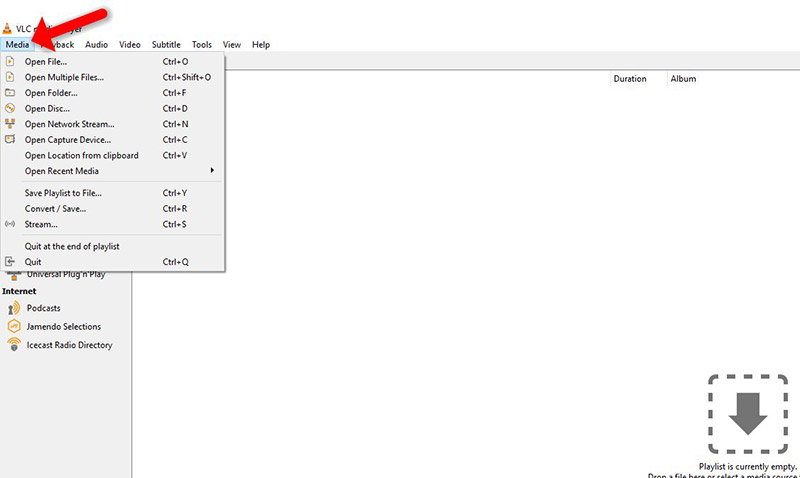 Step 1 – Select Media on the player menu and choose “Open Network Stream.”