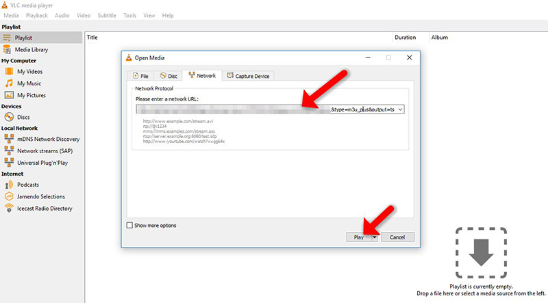 - Enter the M3U URL and click the dropdown arrow next to the Play button.